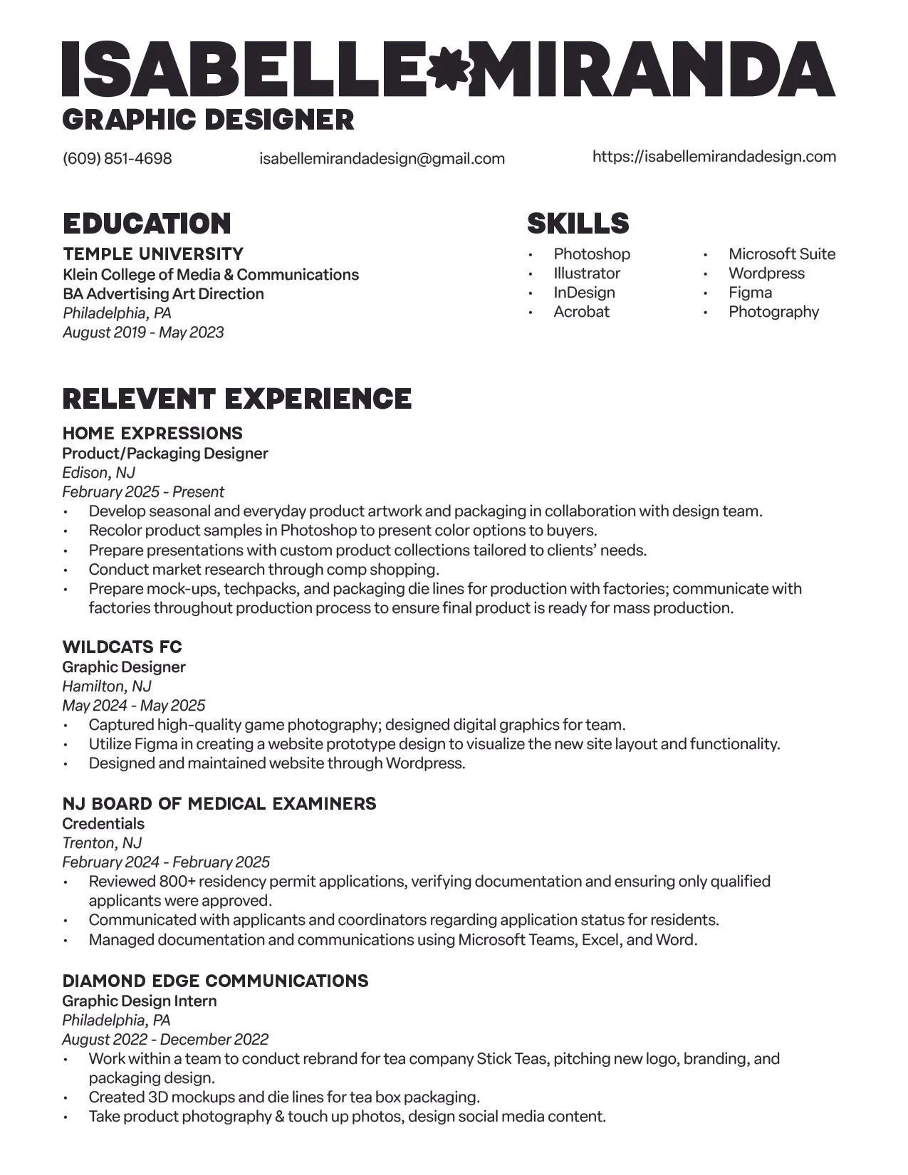 My name is Isabelle, I’m a graphic designer currently based out of Trenton, NJ! I graduated from Temple University in May of 2023, with a BA in Advertising Art Direction from the Klein School of Media and Communications, granting me both a background in design principles, and their applications in marketing & advertising. While I currently work in product/packaging design, I have had the opportunity to work in many facets of design, all present on my portfolio.