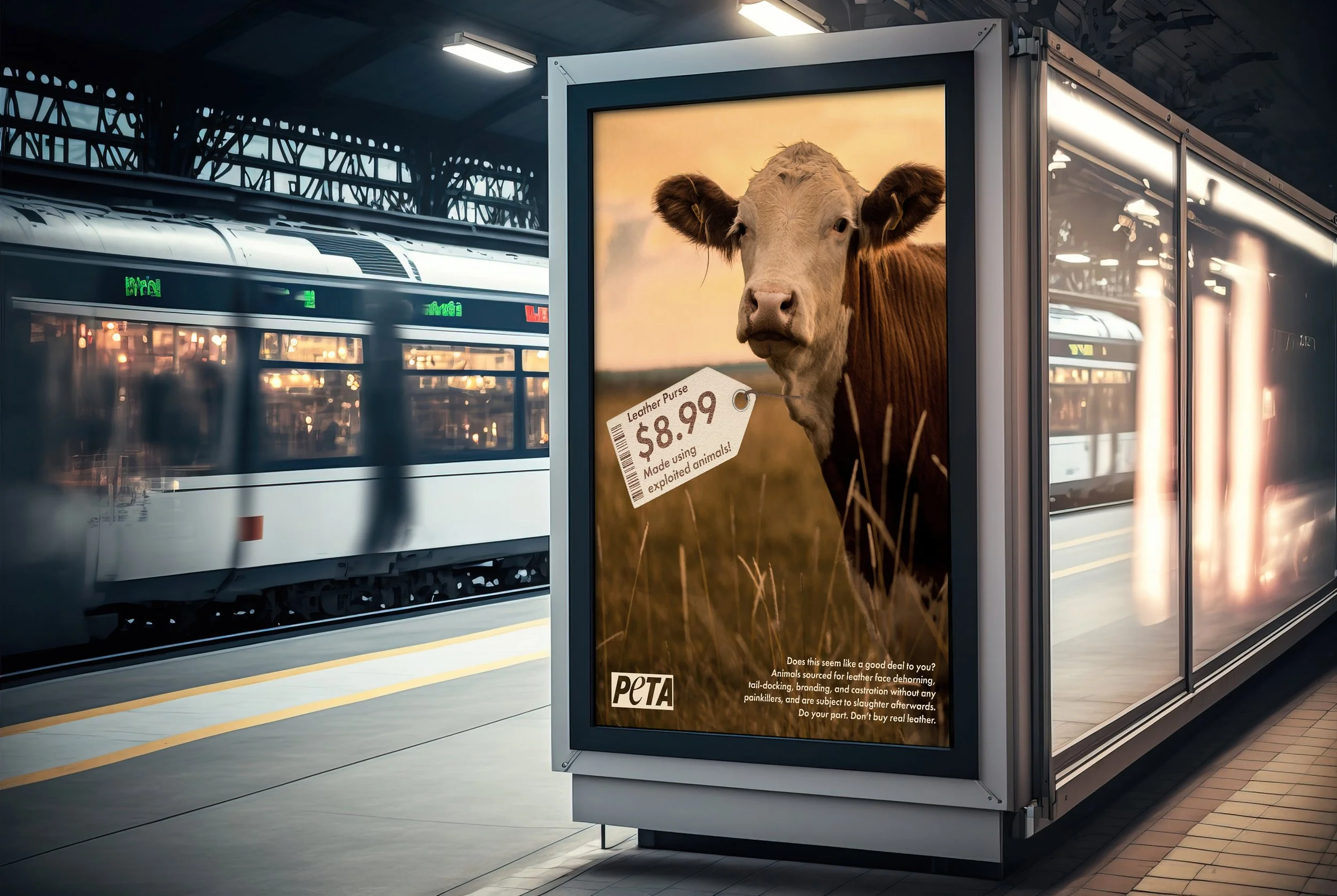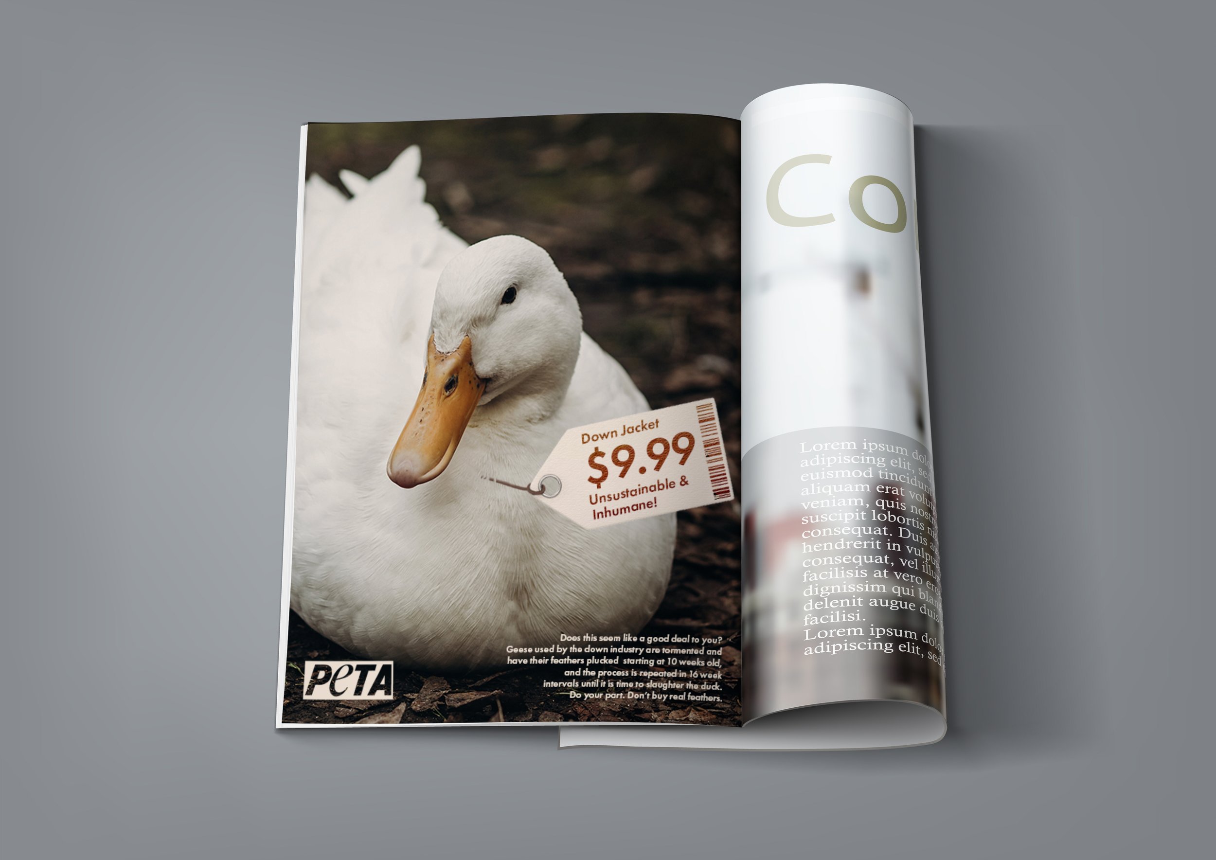 For this campaign, I worked with a brief provided by The One Club and PETA on 'animals used for clothing.” The campaign was meant to target a mainstream audience that wasn't already involved in animals rights/activism, and to make people "think or act." I chose to spread this campaign over a number of tactics that could initially catch one's eye, and entice them to read more on the matter within the advertising.